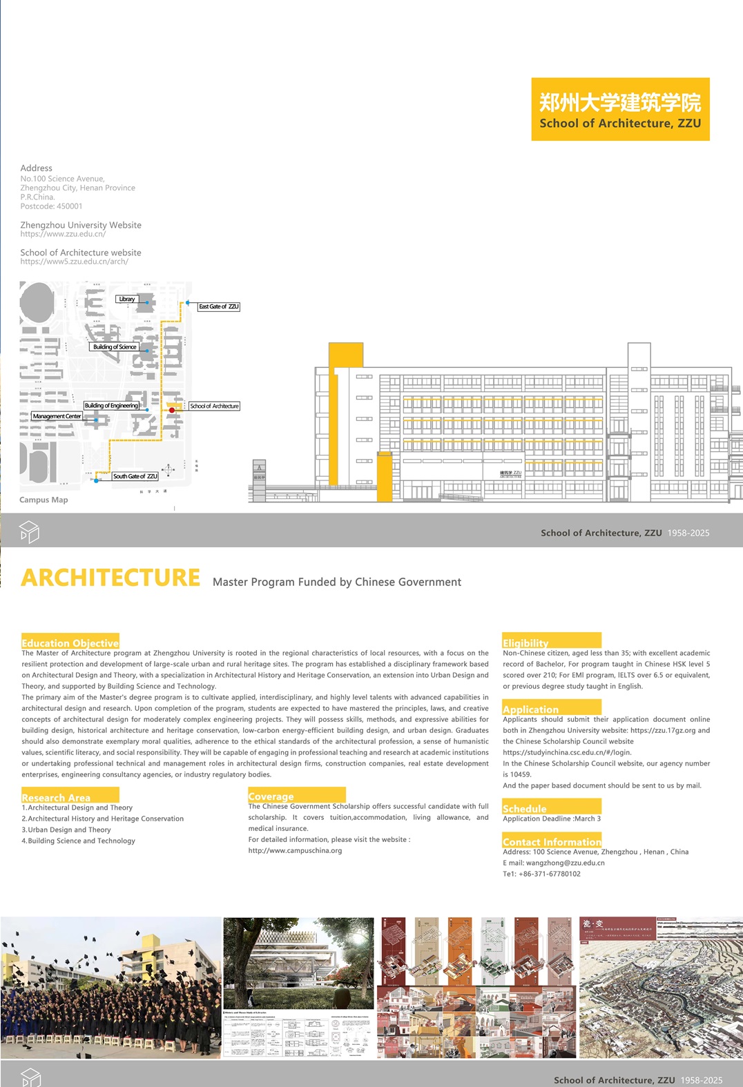 Master of Architecture program at Zhengzhou University is rooted in the regional characteristics of local resources, with a focus on the resilient protection and development of large-scale urban and rural heritage sites. The program has established a disciplinary framework based on Architectural Design and Theory, with a specialization in Architectural History and Heritage Conservation, an extension into Urban Design and Theory, and supported by Building Science and Technology.